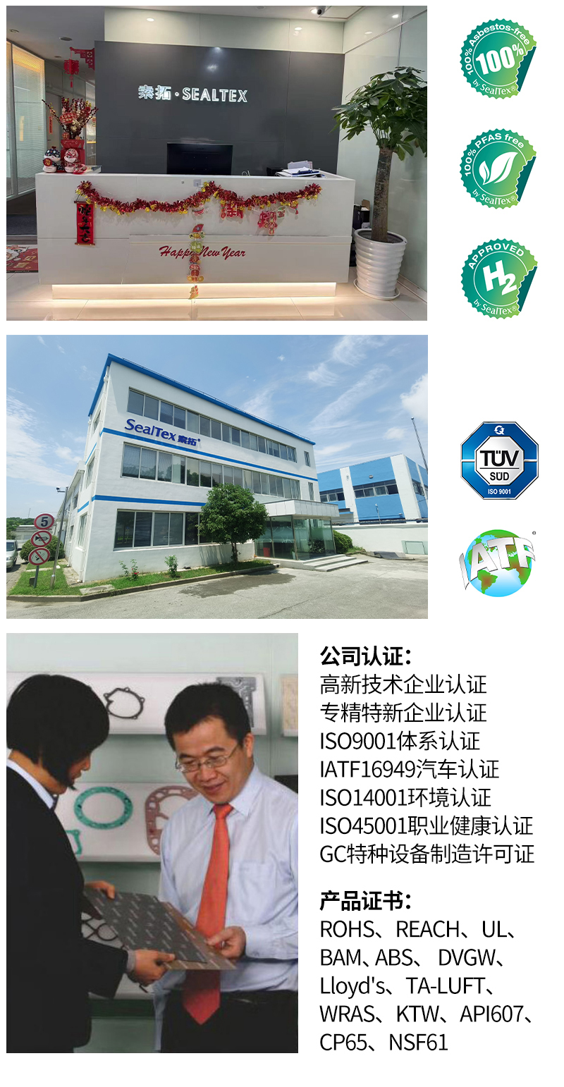 SealTex has been committed to the production and sales of 100% asbestos-free environmental sealing gaskets and high-temp thermal insulation products,  participate in a number of National Standards establishment, engineering support to the customers such as FUJI test and FEA,. SealTex has passed ISO9001, IATF16949, ISO14001, ISO45001 and obtained local GC special equipment manufacturing licence. The production locates in Songjiang Industrial Park, Shanghai, with various processing equipment to achieve vertical production system from raw material compounding to precision die-cutting.