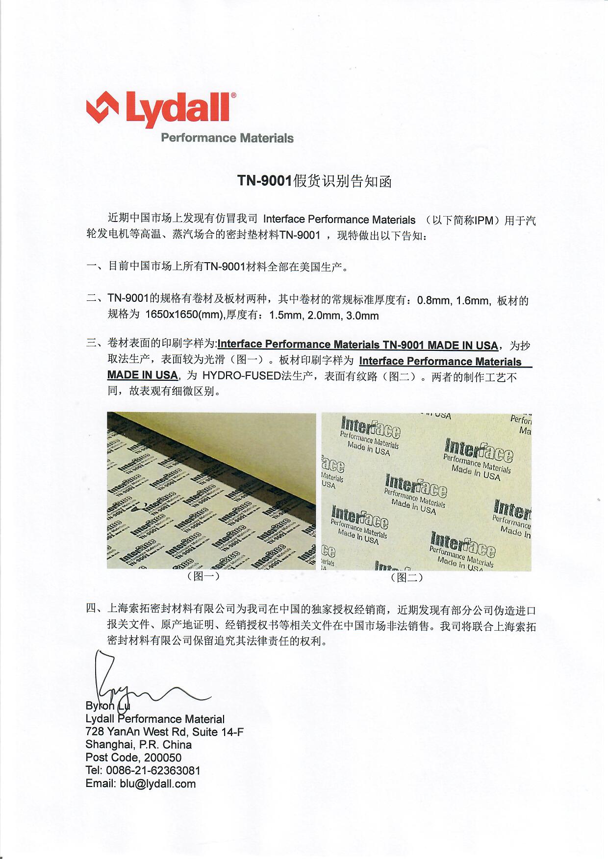 美國因特費斯廠家緊急出具TN-9001假貨識別告知函 近期中國市場上發現有仿冒InterFace Performance Materials用于汽輪發電機等高溫、蒸汽場合的密封材料TN-9001,現特作出以下告知: 在此我們對長期支持并使用正版美國INTERFACE產品、維護知識產權的用戶表示忠心的感謝! 上一個 返回列表 下一個