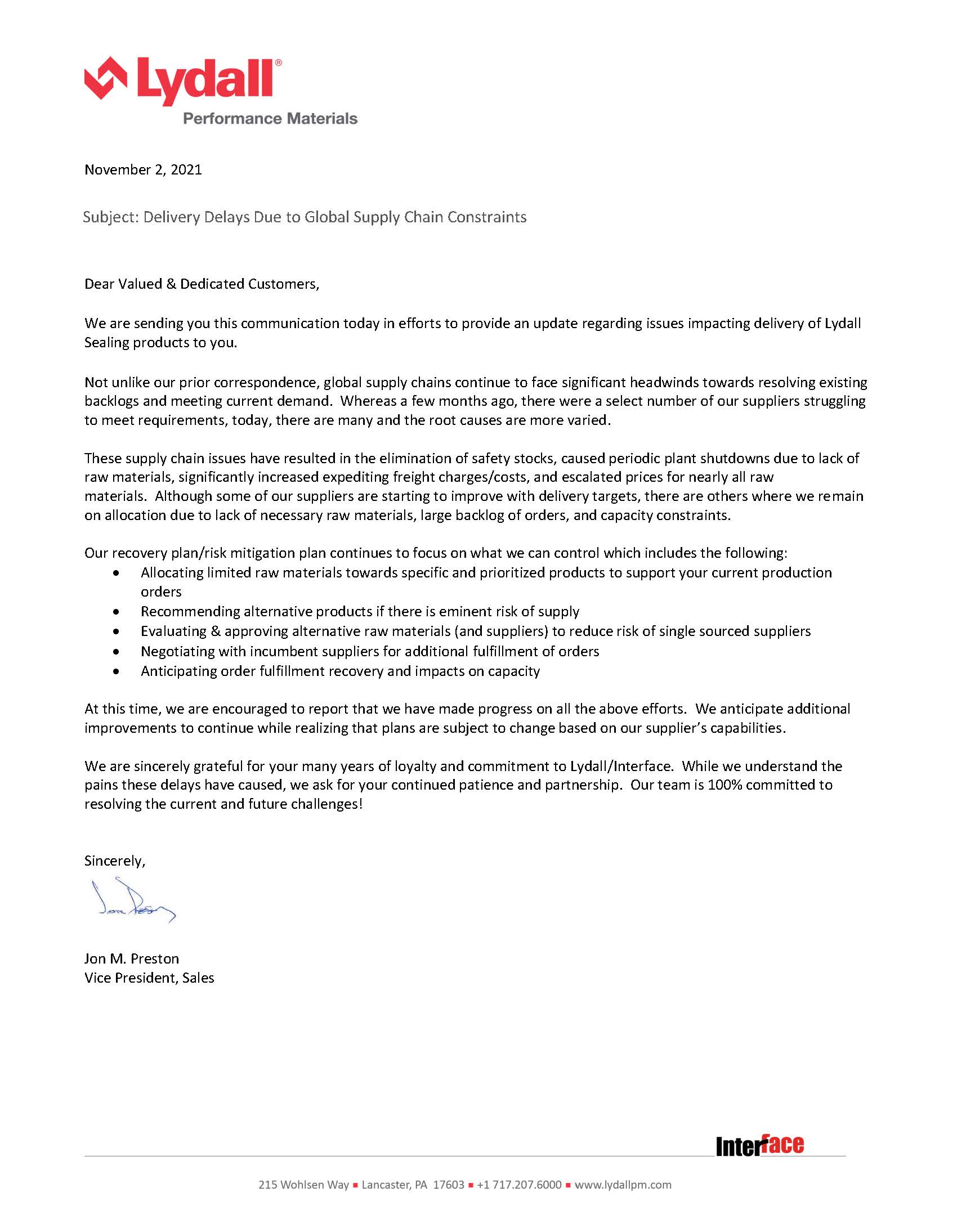 關于CMP-4000等InterFace材料延期交貨的通知
