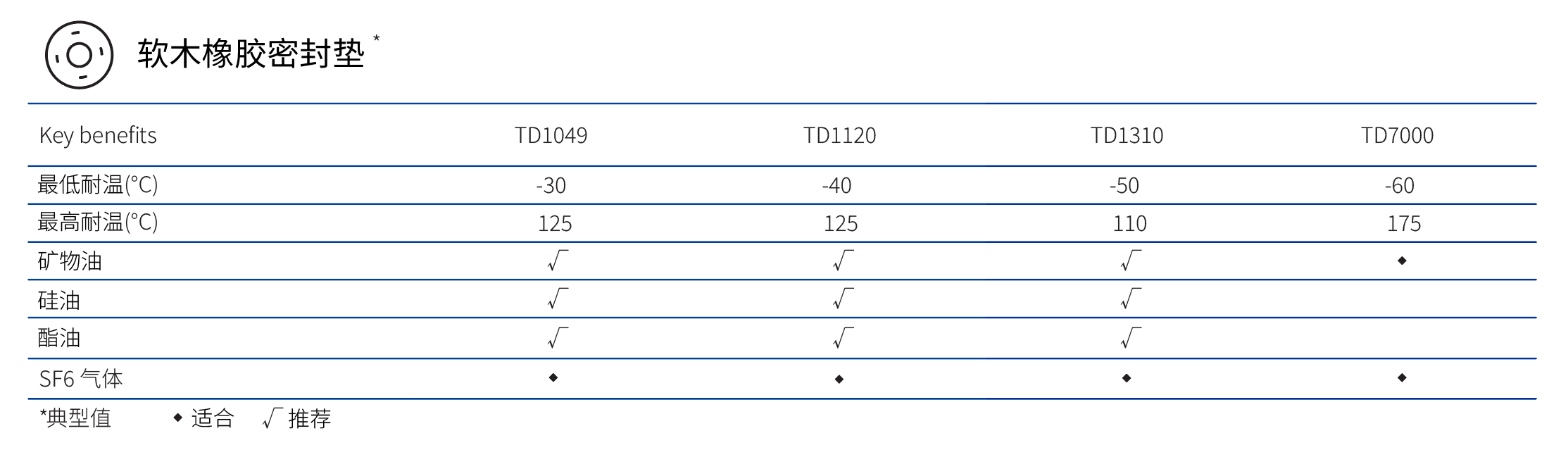 AMORIM阿莫林軟木橡膠密封材料TD1120、TD1049、TD1310、TD7000因其良好的機(jī)械性能、耐變壓器油等特性廣泛應(yīng)用于變壓器行業(yè)。詳細(xì)參數(shù)如下: