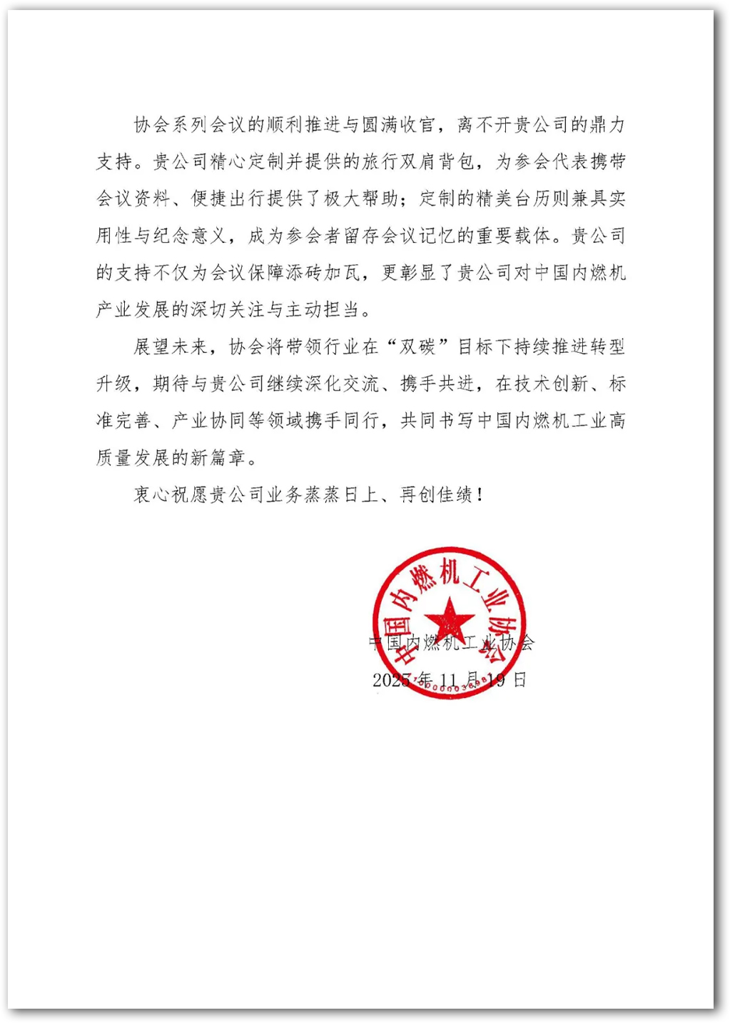 來自中國內燃機工業協會的感謝信 近日,我司收到來自中國內燃機工業協會的感謝信,也借此機會感謝協會的多年信任和支持,作為會員我們一直全力盡責盡職并很榮幸作為其中一員推動協會和行業的發展。并再次祝賀大會的成功召開。 上一個 返回列表 下一個
